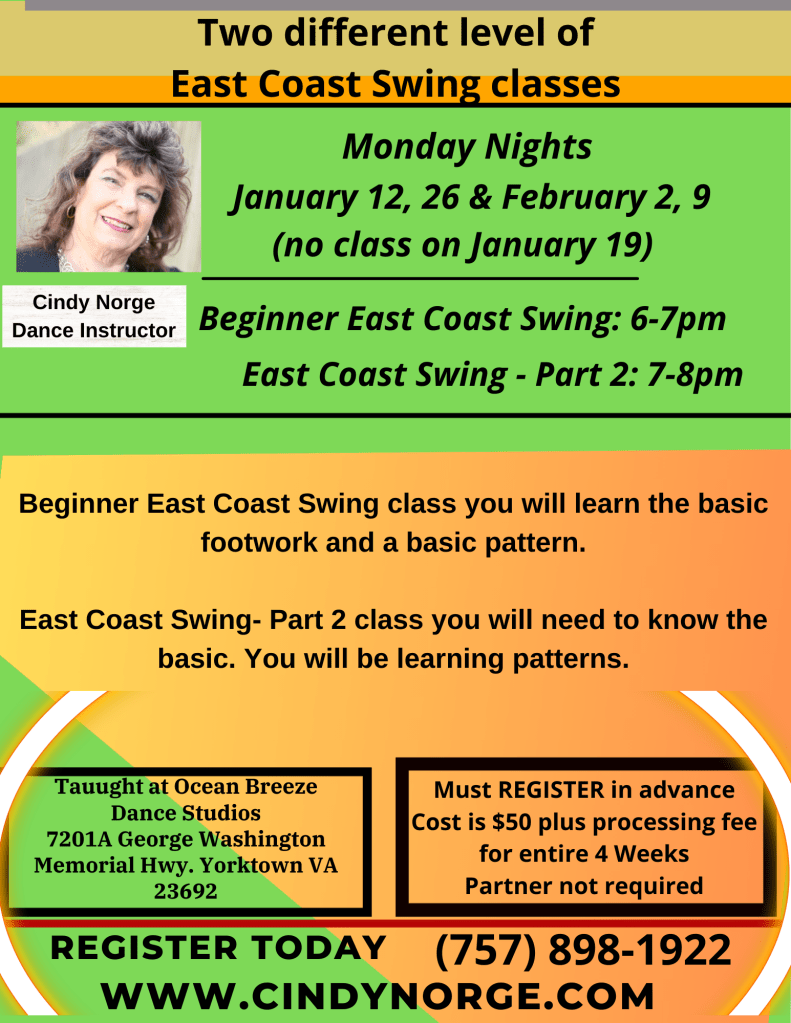 Classes I’m offering at Ocean Breeze Dance Studio (7201a George Washington Memorial Highway, Yorktown VA 23692)